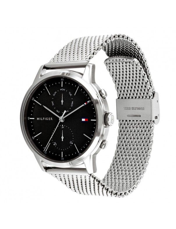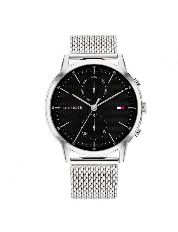 Reloj Tommy Hilfiger Hombre Easton 1710433, analógico multifunción. Esfera negra de 44mm de diámetro, compuesta por dos mini esferas que indican el día del mes y de la semana. Cristal mineral y pulsera milanesa de acero. Sumergible a 5ATM, por lo que es apto para ducha y baño sin inmersión.
