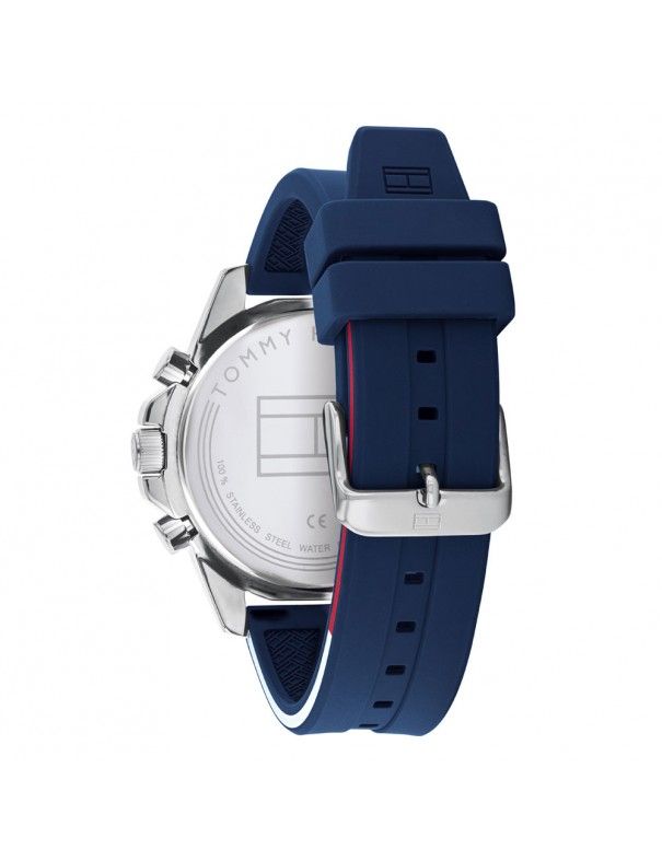 Reloj Tommy Hilfiger Hombre Mason 1791791, analógico multifunción. Esfera azul de 45mm de diámetro con tres mini esferas (día del mes, día de la semana y formato 24 horas). Pulsera de caucho azul y cristal mineral. Sumergible a 3ATM, por lo que sólo soporta pequeñas salpicaduras.