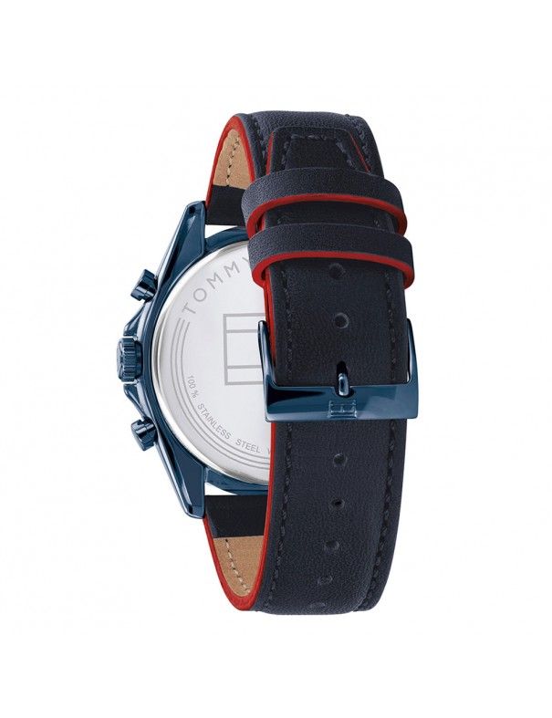 Reloj Tommy Hilfiger Hombre Parker 1791839, analógico multifunción. Esfera azul de 44mm de diámetro con tres mini esferas (día del mes, día de la semana y formato de 24 horas). Agujas e indicadores luminiscentes. Pulsera de piel color azul y cristal mineral. Sumergible a 5ATM, por lo que es apto para ducha y baño sin inmersión.