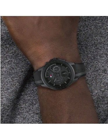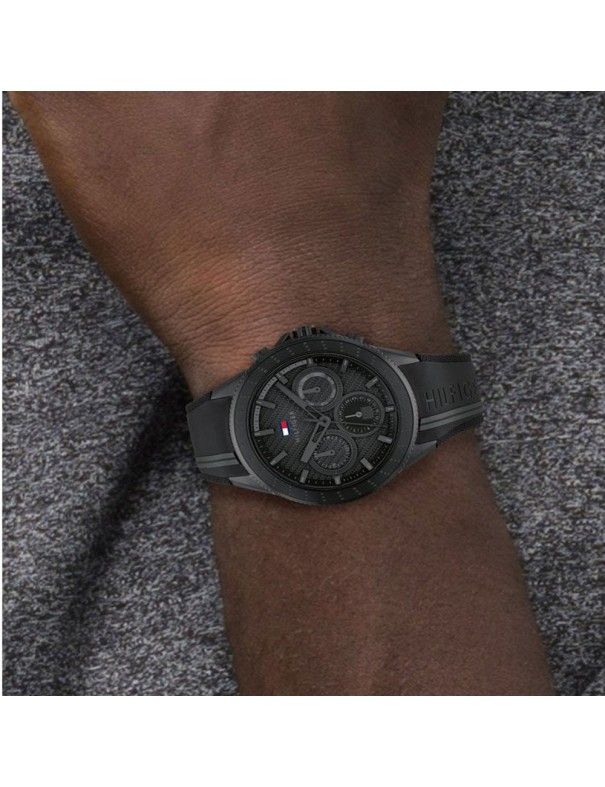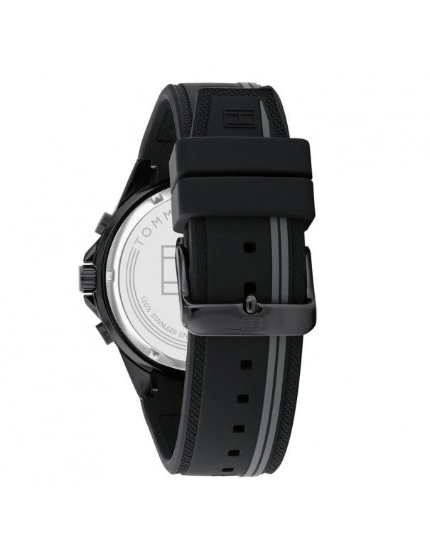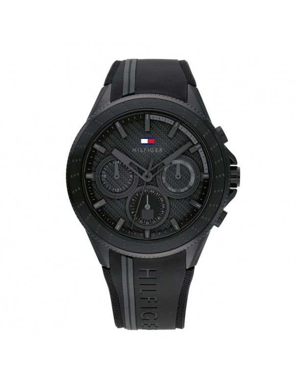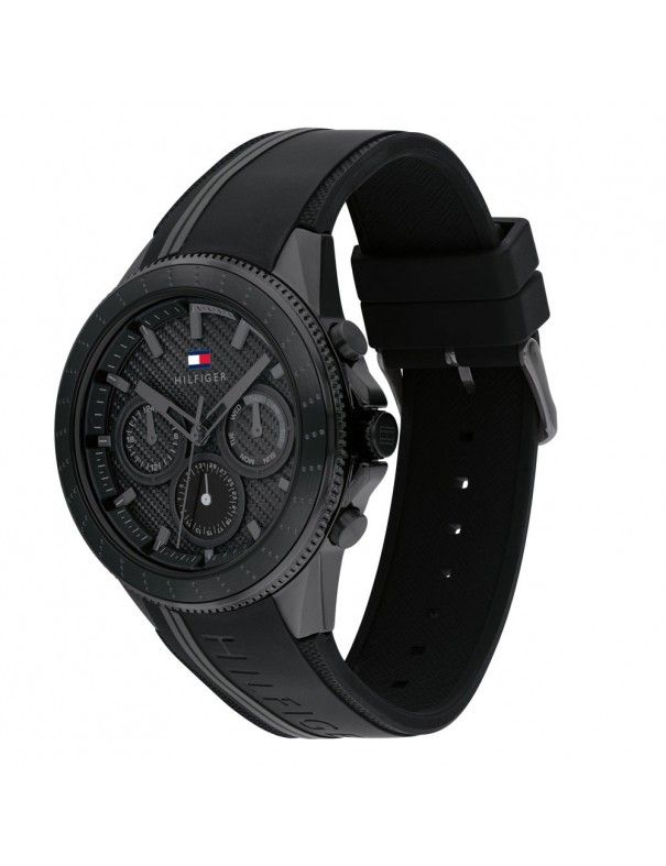 Reloj Tommy Hilfiger Hombre Aiden 1791861, analógico multifunción. Caja de 47mm de diámetro. Pulsera de caucho negro. Cristal mineral. Sumergible a 5ATM, por lo que es apto para ducha y baño sin inmersión.
