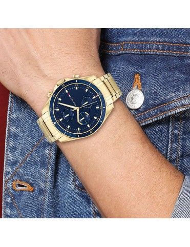 Reloj Tommy Hilfiger Hombre Parker 1791834, analógico multifunción. Pulsera de acero y caja de acero bañado en color dorado de 44mm de diámetro. Esfera azul con mini esfera de calendario, día de la semana y formato 24 horas. Cristal mineral. Sumergible a 5 ATM, por lo que es apto para ducha y baño sin inmersión.