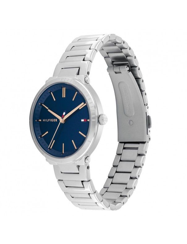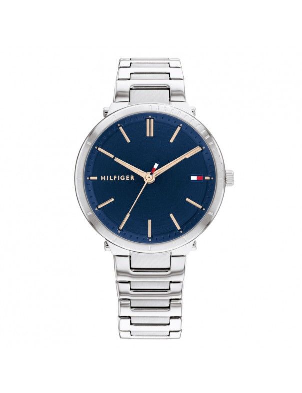 Reloj Tommy Hilfiger Mujer Zoey 1782405, analógico de 3 agujas. Caja d 34mm de acero inoxidable, esfera azul tornasolada con indicadores. Brazalete de eslabones acero inoxidable. Cristal mineral. Sumergible a 3ATM, por lo que sólo soporta pequeñas salpicaduras.