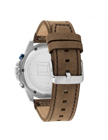 Reloj Tommy Hilfiger Hombre Harley 1791895, analógico multifunción. Caja acero inoxidable de 46mm, bisel y esfera azul. Correa de cuero marrón con pespunte. Cristal mineral. Sumergible a 5ATM, por lo que es apto para ducha y baño sin inmersión.