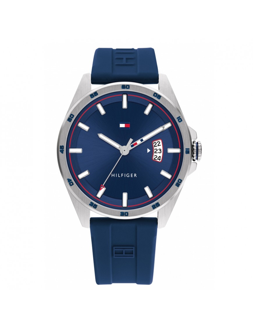 Reloj Tommy Hilfiger Carter 1791982, analógico. Caja de acero de 42mm de diámetro. Pulsera de caucho azul. Ventana de calendario. Agujas e indicadores luminiscentes. Sumergible a 5ATM, por lo que es apto para ducha y baño sin inmersión.