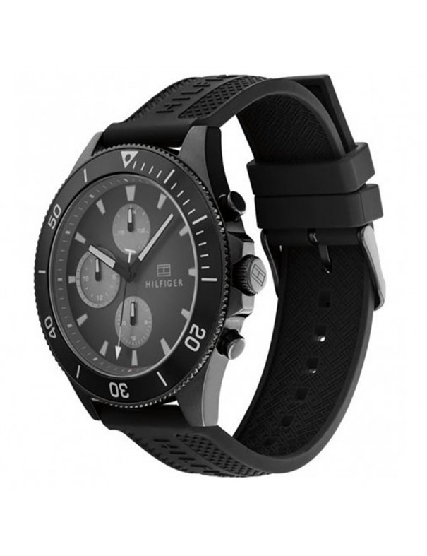 Reloj Tommy Hilfiger Caballero Larson 1791921, analógico multifunción. Caja de acero en color negro, de 46mm de diámetro. Pulsera de caucho negro. Agujas e indicadores luminiscentes. Cristal mineral.