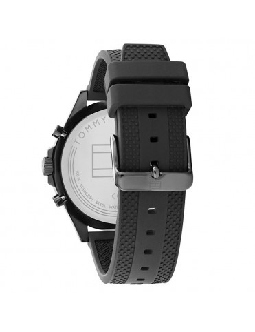 Reloj Tommy Hilfiger Caballero Larson 1791921, analógico multifunción. Caja de acero en color negro, de 46mm de diámetro. Pulsera de caucho negro. Agujas e indicadores luminiscentes. Cristal mineral. Sumergible a 5ATM, por lo que es apto para ducha y baño sin inmersión.