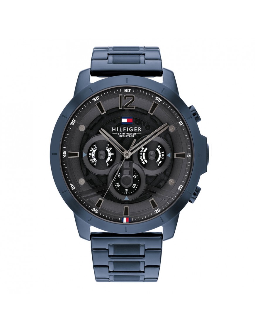 Reloj Tommy Hilfiger Luca Hombre 1710493, analógico de tres agujas. Caja de acero en color azul de 50mm de diámetro. Esfera con tres miniesferas indicando día de la semana, día del mes y formato de 24 horas. Cristal mineral. Pulsera de acero en color azul. Sumergible a 5ATM, por lo que es apto para ducha y baño sin inmersión.