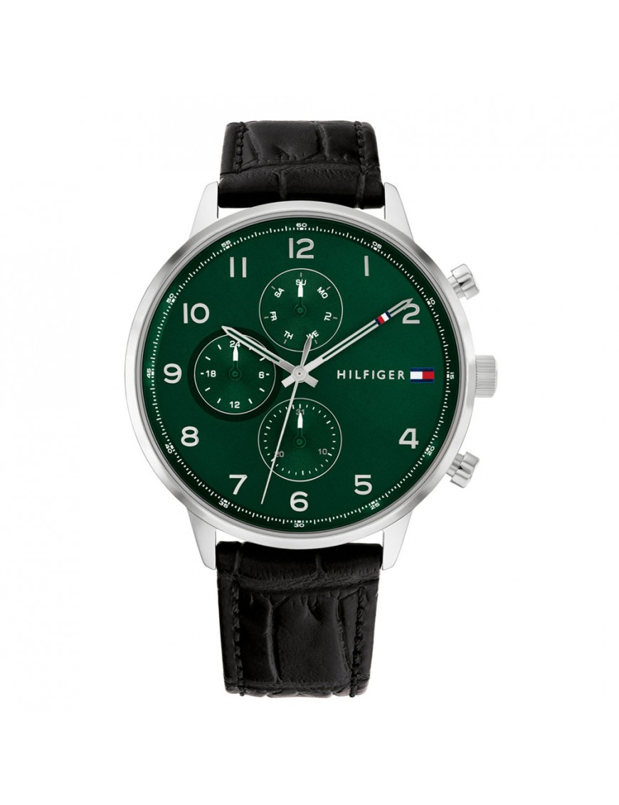 Reloj Tommy Hilfiger Leonard Hombre 1791985, analógico de tres agujas. Caja de acero de 44mm de diámetro. Cristal mineral. Pulsera de piel. Tres miniesferas indicando día del mes, día de la semana y formato 24 horas. Sumergible a 5ATM, por lo que es apto para ducha y baño sin inmersión.