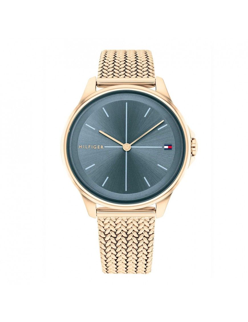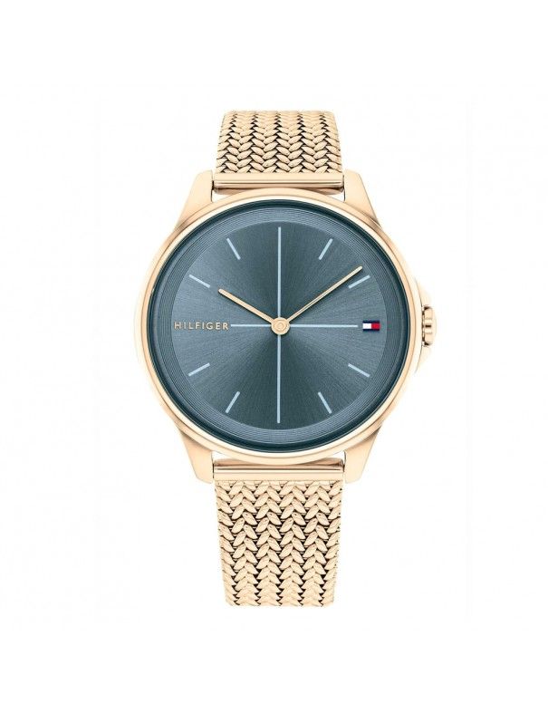 Reloj Tommy Hilfiger Mujer Delphine 1782356, analógico sin segundero. Esfera de 35mm de diámetro. Pulsera milanesa de acero dorado. Cristal mineral. Sumergible a 3ATM, por lo que sólo soporta pequeñas salpicaduras.