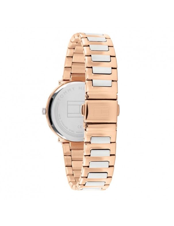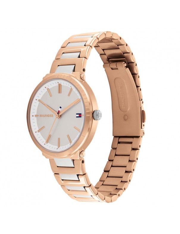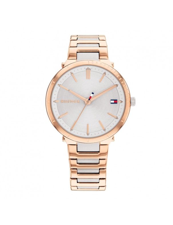 Reloj Tommy Hilfiger Mujer Zoey 1782406, analógico de 3 agujas. Caja de 34mm de acero inoxidable pavonado en oro rosa, esfera plateada tornasolada con indicadores. Brazalete de eslabones acero inoxidable bicolor pavonado en oro rosa. Cristal mineral. Sumergible a 3ATM, por lo que sólo soporta pequeñas salpicaduras.