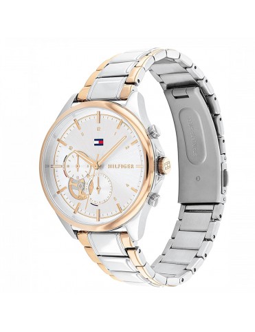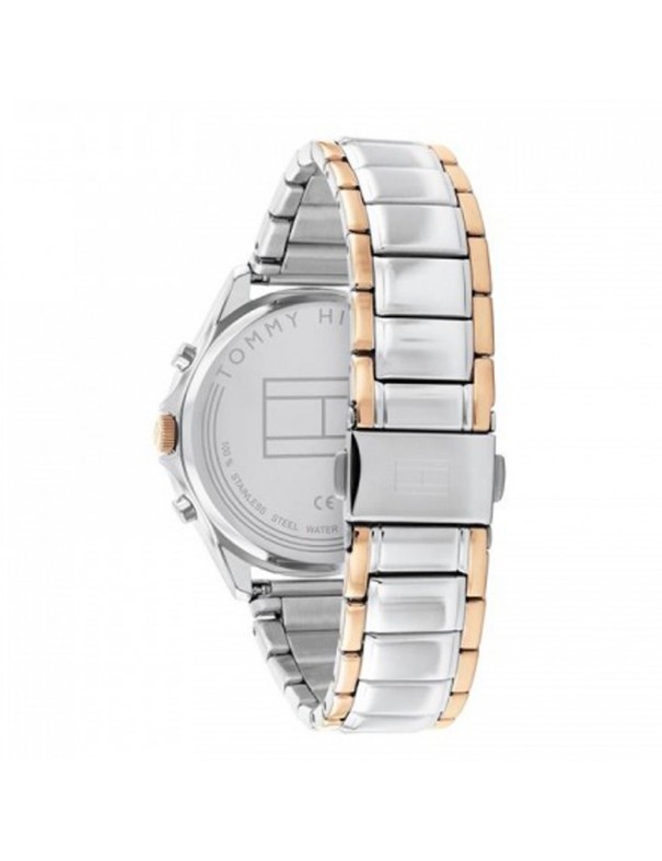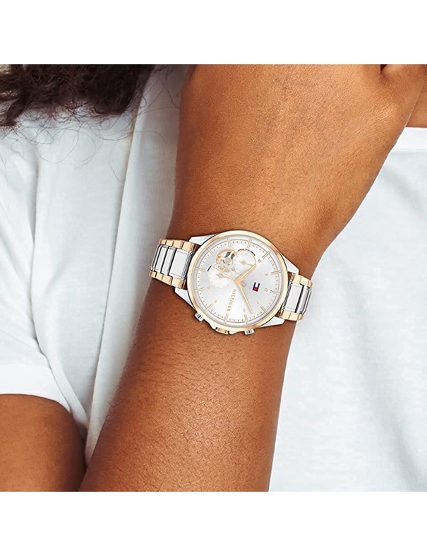 Reloj Tommy Hilfiger Mujer Quinn 1782415, analógico multifunción. Agujas e indicadores luminiscentes. Caja de acero de 38mm de diámetro. Bisel en color cobrizo. Pulsera de acero bicolor. Cristal mineral. Calendario y formato de 24 horas. Sumergible a 3ATM, por lo que sólo soporta pequeñas salpicaduras.