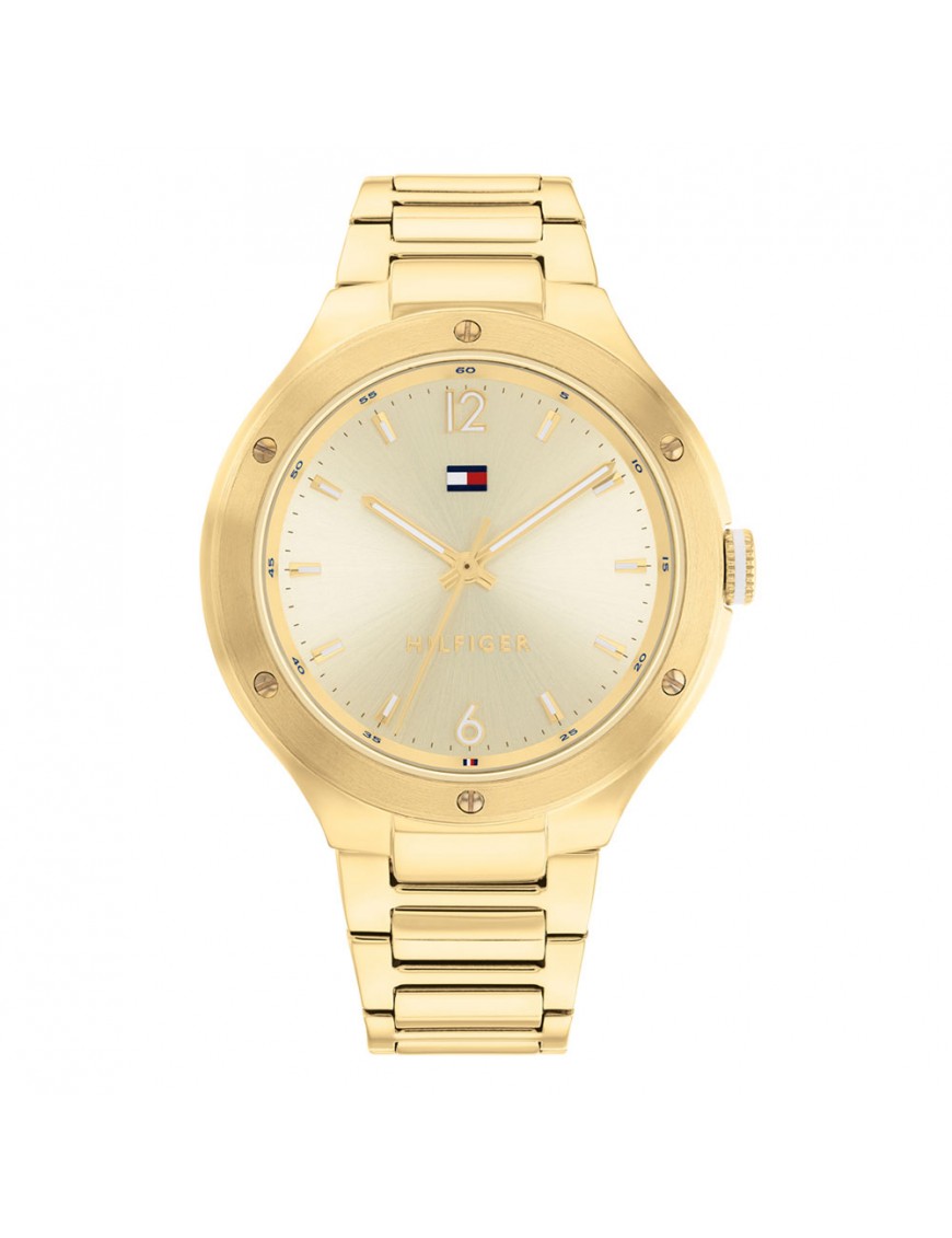 Reloj Tommy Hilfiger Layla Mujer 1782458, analógico multifunción. Caja de acero en color dorado de 38mm de diámetro. Calendario, día del mes y formato de 24 horas. Pulsera de acero milanesa dorada. Cristal mineral. Sumergible a 3ATM, por lo que sólo soporta pequeñas salpicaduras.