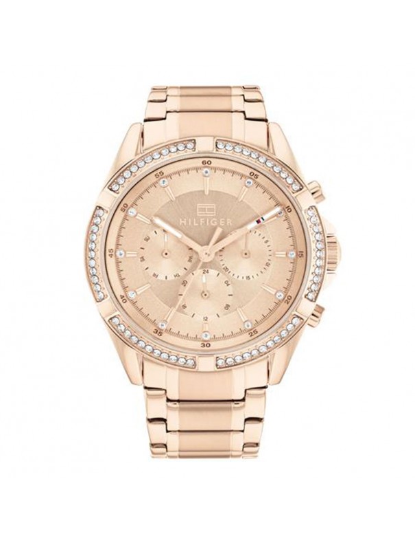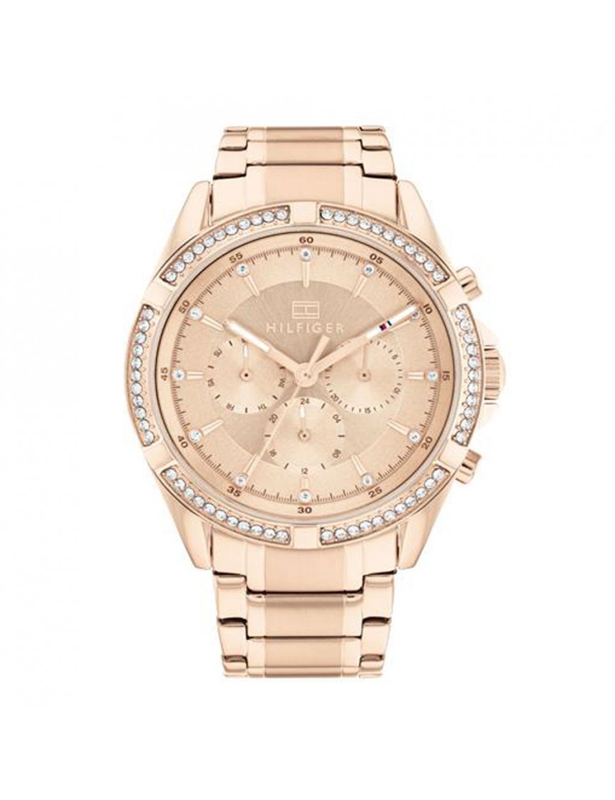 Reloj Tommy Hilfiger Kenzie Mujer 1782558, analógico multifunción. Caja de acero en color oro rosa de 40mm de diámetro. Calendario, día de la semana y formato de 24 horas. Pulsera de acero en color oro rosa. Cristal mineral. Sumergible a 5ATM, por lo que es apto para ducha y baño sin inmersión.