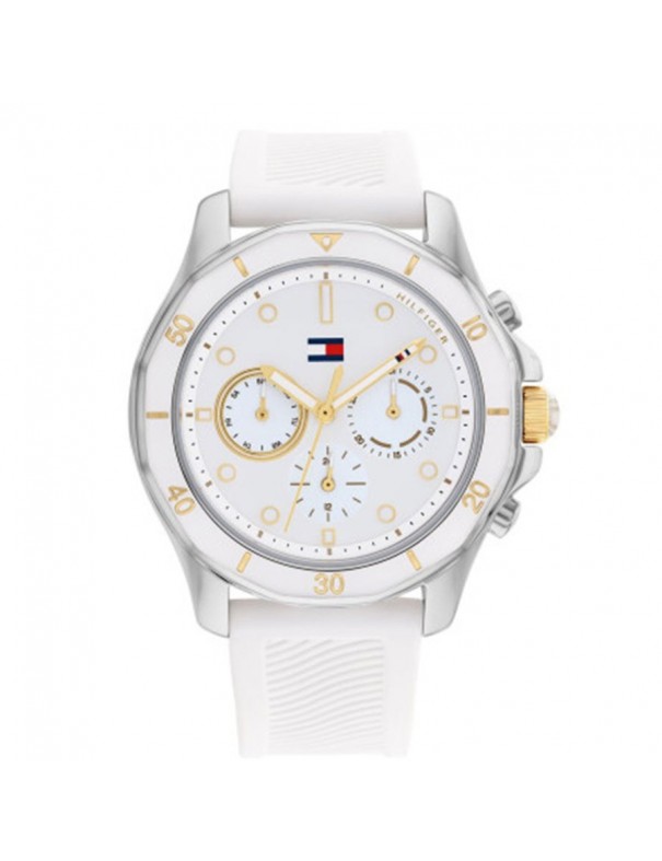 Reloj Tommy Hilfiger para mujer 1782568. La esfera es de acero y mide 40 mm de diámetro. La pulsera es de silicona. Es un modelo multifunción que incluye día de la semana y día del mes. Es sumergible a 5 ATM y permite el nado en superficie sin inmersión. Garantía de tres años.