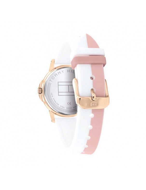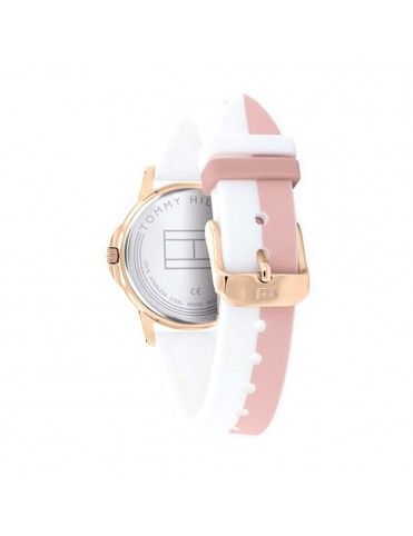 Reloj Tommy Hilfiger Niña Communion 1720015, analógico con segundero. Esfera de 32mm de diámetro, pulsera de caucho bicolor (blanca y rosa) y cristal mineral. Agujas luminiscentes. Sumergible a 3ATM, por lo que sólo soporta pequeñas salpicaduras.