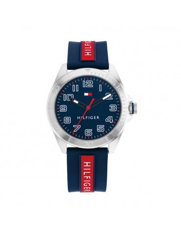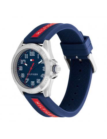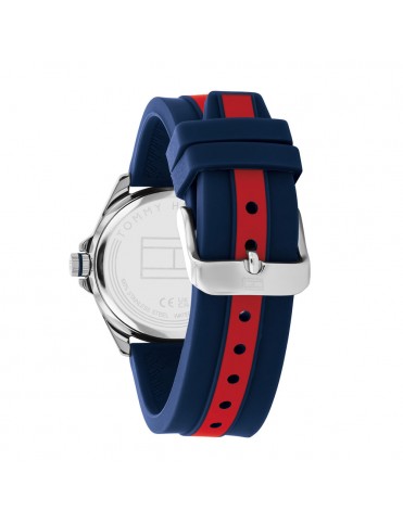 Reloj Tommy Hilfiger Niño Comunión 1720019, analógico de tres agujas. Caja de acero de 34mm de diámetro. Pulsera de caucho. Cristal mineral. Agujas luminiscentes. Sumergible a 3ATM, por lo que sólo soporta pequeñas salpicaduras.