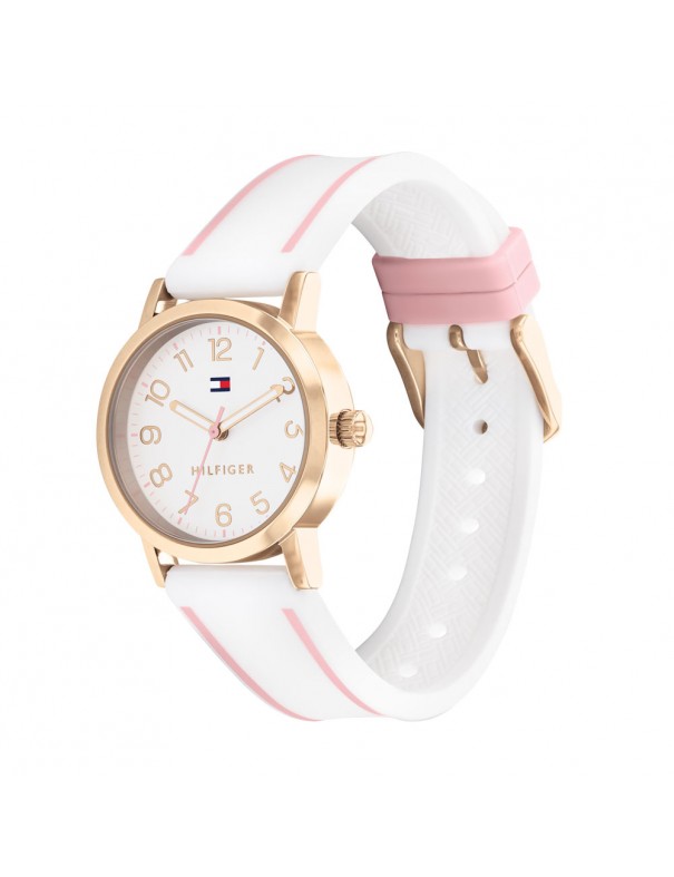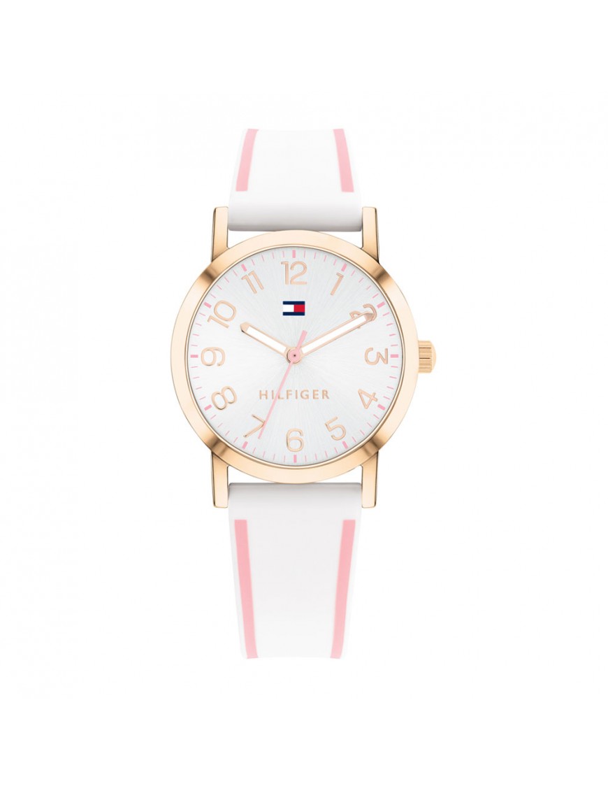 Reloj Tommy Hilfiger Niña Comunión 1720023, analógico de tres agujas. Caja de acero de 34mm de diámetro en color cobrizo. Pulsera de caucho. Cristal mineral. Agujas luminiscentes. Sumergible a 3ATM, por lo que sólo soporta pequeñas salpicaduras.