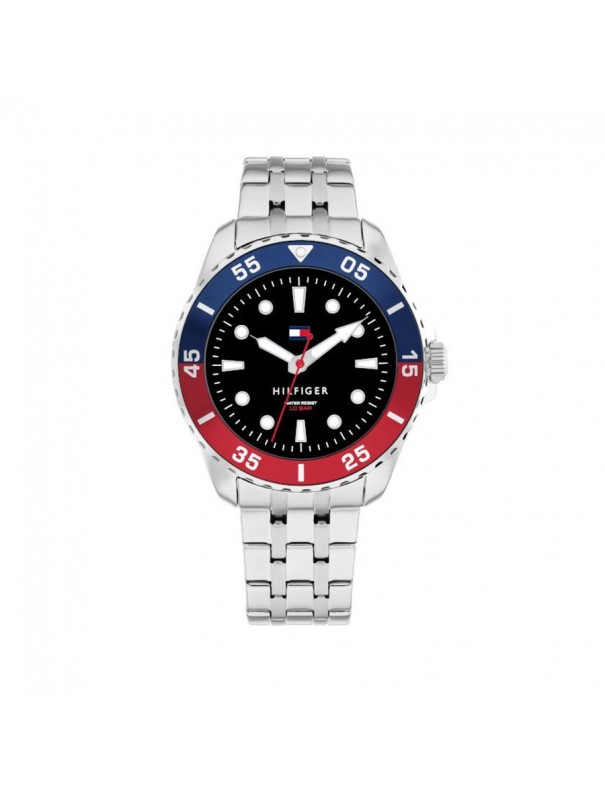 Reloj Tommy Hilfiger Niño 1720048. Caja de acero de 36 mm de diámetro con bisel en color azul y rojo con esfera en color azul bajo un cristal mineral. La correa es de acero de eslabones con cierre de doble pulsador. Sumergible hasta 10 ATM. Garantía de 3 años.