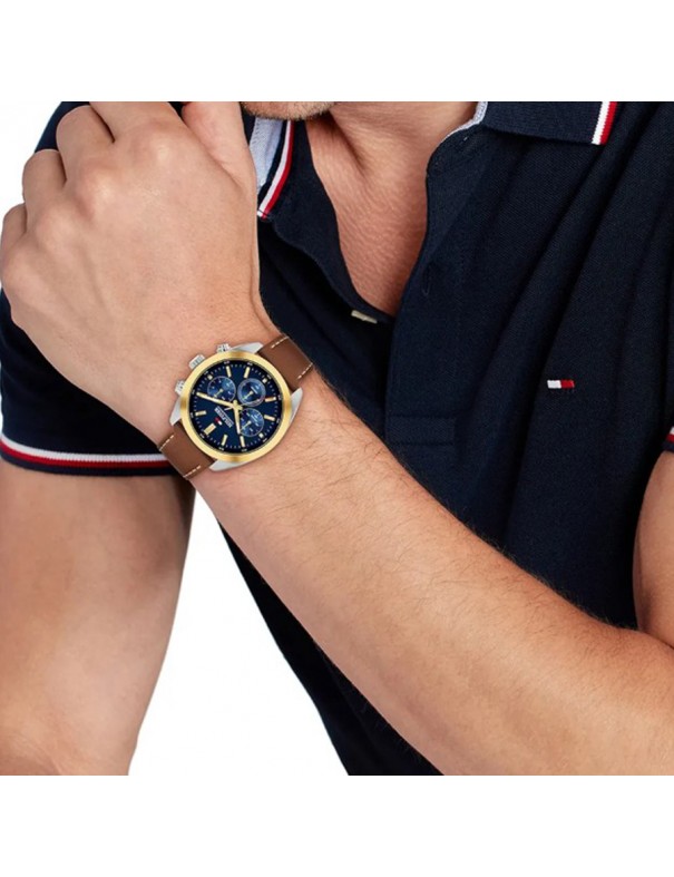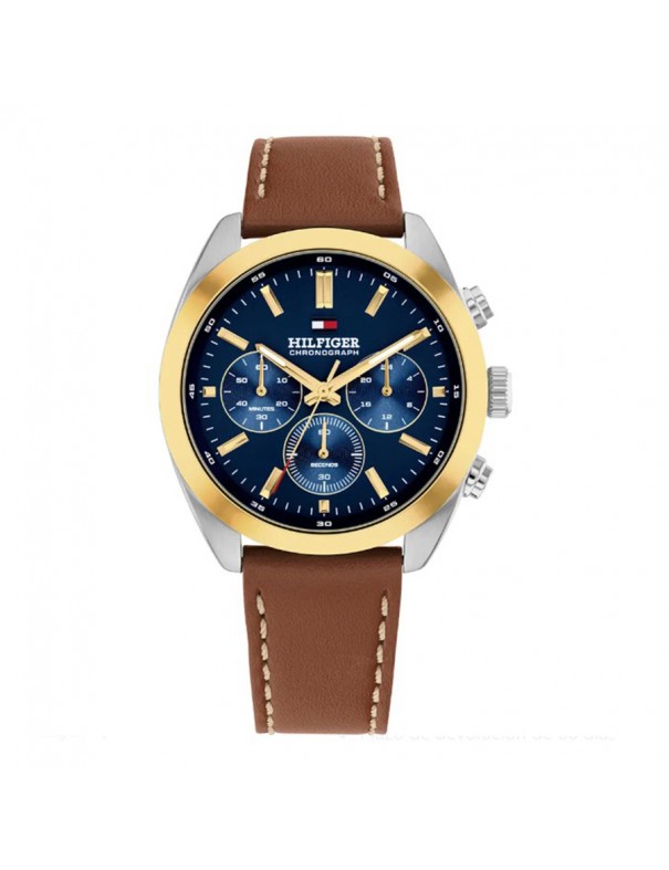 Reloj Tommy Hilfiger Cronógrafo 1710720. Caja de acero inoxidable bicolor, esfera azul oscuro, correa de piel marrón con cierre tipo hebilla. Cuenta con funciones de cronógrafo (incluye subesfera de 24 h) y movimiento de cuarzo. Resistente al agua hasta 5 bar. Garantía de 3 años.