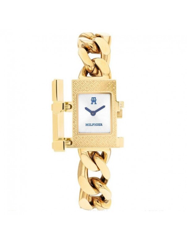 Reloj Tommy Hilfiger Dorado Mujer 1782823. Caja de acero inoxidable con baño dorado y esfera plateada. La pulsera de acero dorado tipo pulsera cuenta con una tapa abatible que oculta el reloj, cierre desplegable. El movimiento es de cuarzo. Resistente al agua hasta 3 bar.