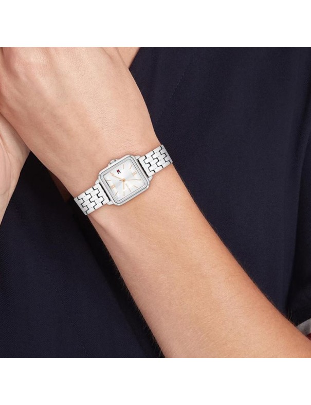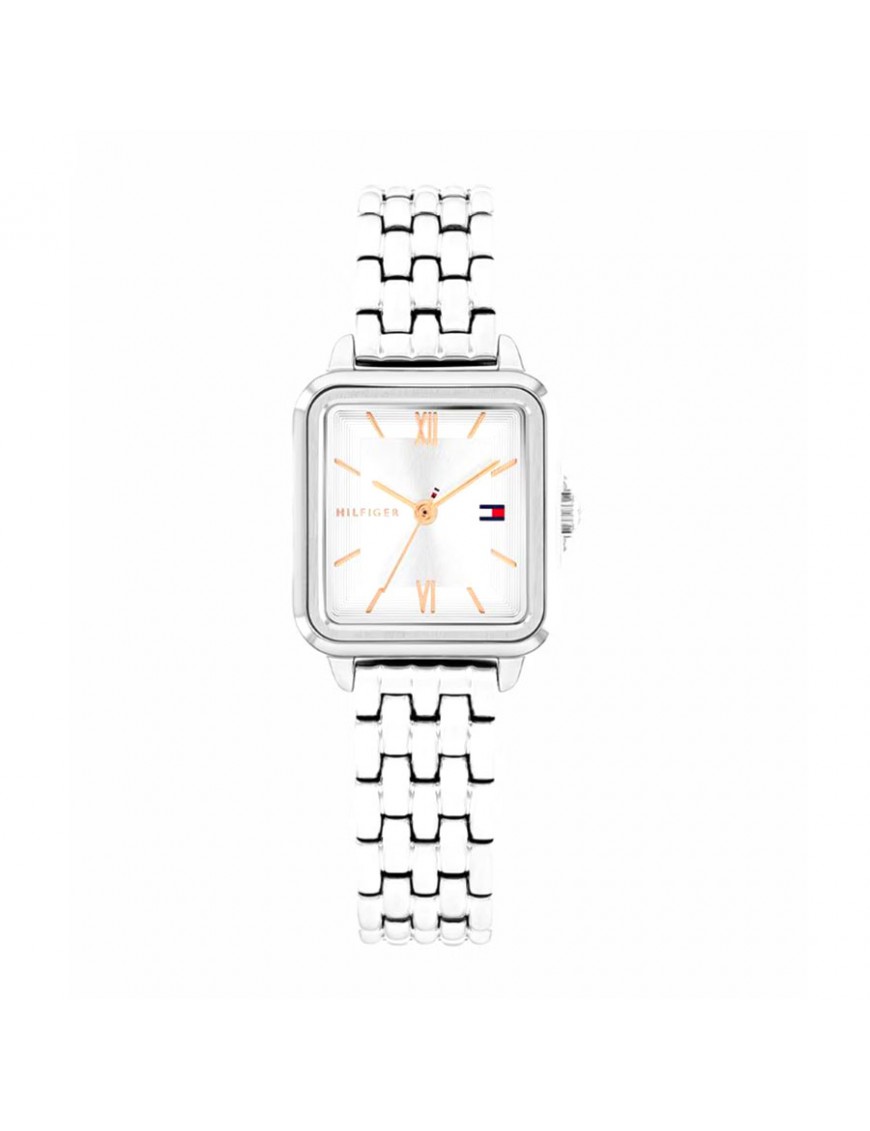 Reloj Tommy Hilfiger Mia 1782830. Reloj de mujer con caja rectangular de acero inoxidable plateado y esfera plateada analógica con manecillas en tono oro rosado, sin piedras decorativas. Tiene mecanismo de cuarzo, cristal mineral resistente y brazalete de acero plateado con cierre desplegable.
