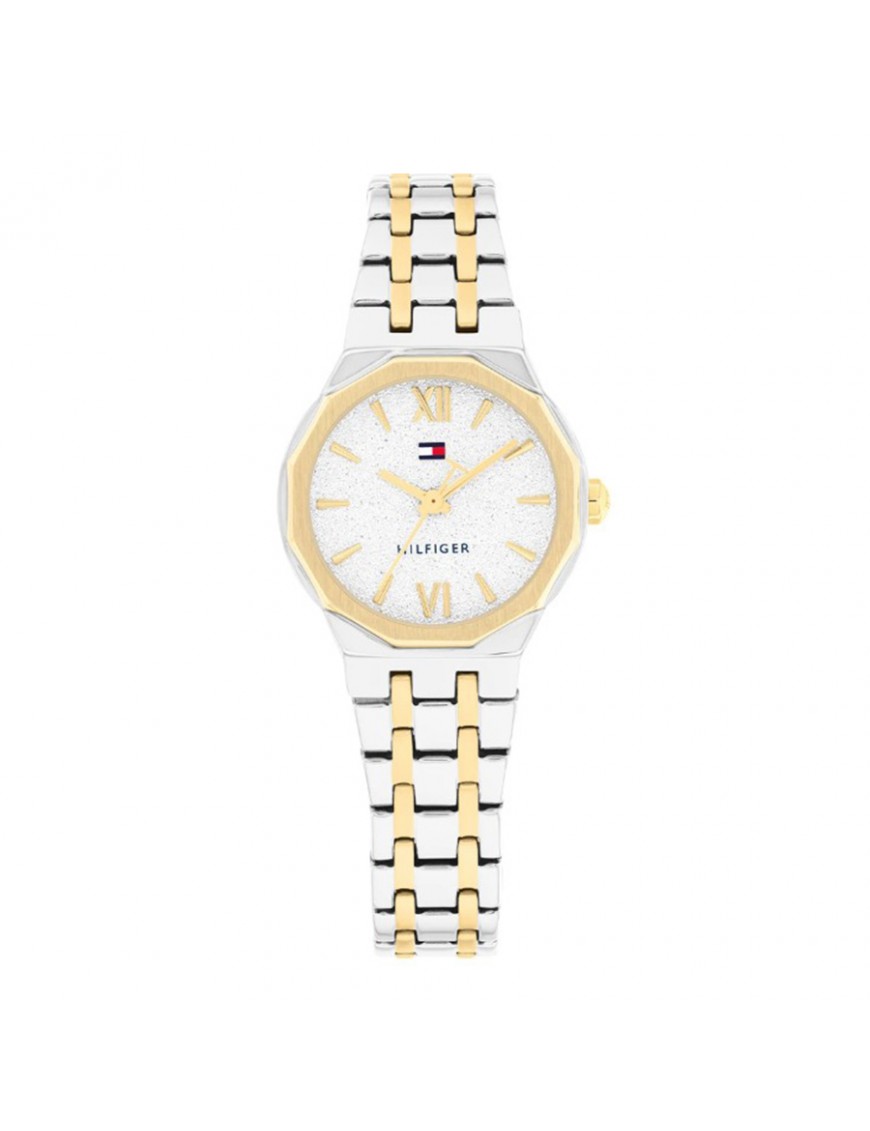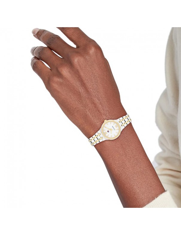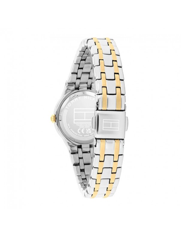 Reloj Tommy Hilfiger Señora 1782888. elegante reloj de mujer que combina un diseño clásico con un estilo moderno y sofisticado, ideal para quienes buscan un accesorio versátil que destaque tanto en ocasiones formales como en el día a día. Su caja redonda de acero inoxidable chapado en oro amarillo de 25 mm aporta un acabado refinado y delicado que acompaña perfectamente la muñeca femenina, sin resultar recargado. La esfera blanco-plateada con índices facetados y números romanos refuerza la estética elegante y facilita la lectura del tiempo con claridad. Este modelo funciona con movimiento de cuarzo Seiko de alta precisión, una opción fiable y de bajo mantenimiento para uso diario. El brazalete integrado de acero inoxidable con acabado bicolor (oro amarillo y plateado) no solo aporta un contraste visual atractivo, sino que también ofrece comodidad y durabilidad. Gracias a su resistencia al agua de 3 ATM (30 m).