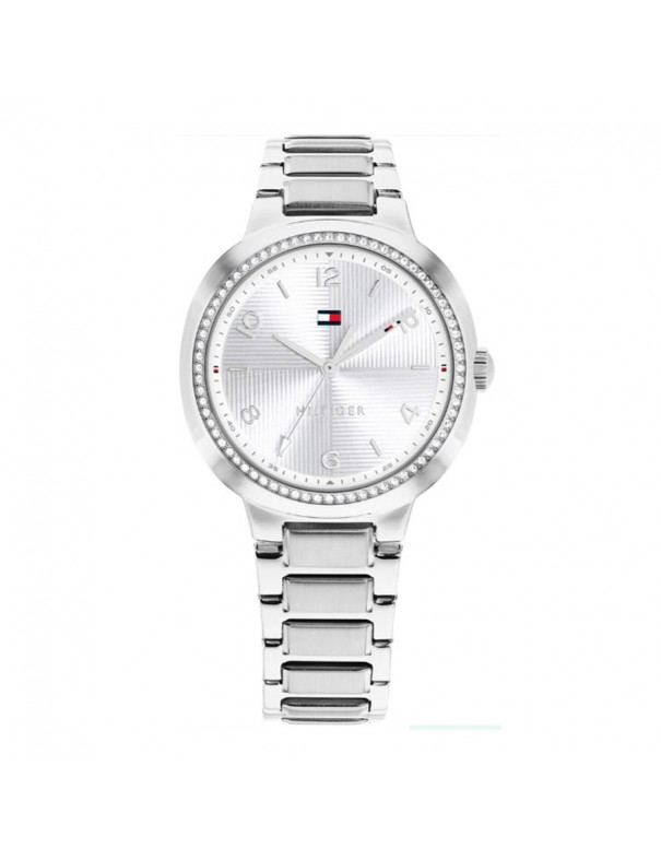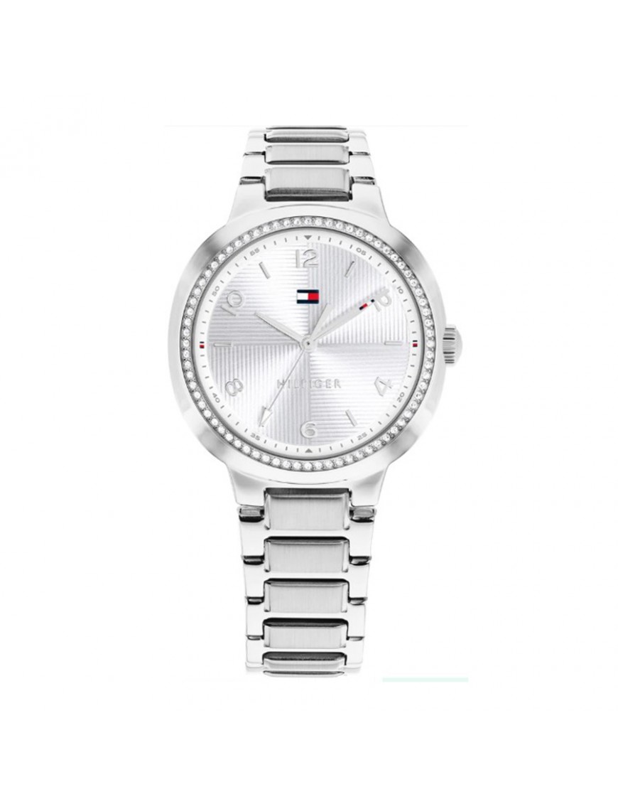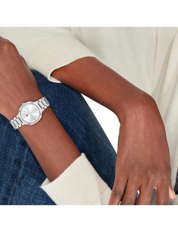 Reloj Tommy Hilfiger 1782899. Reloj de mujer elegante y versátil diseñado por Tommy Hilfiger que incorpora una caja redonda de acero inoxidable de 32 mm con acabado pulido, impulsado por un movimiento de cuarzo preciso y protegido por cristal mineral resistente a los arañazos; su esfera plateada con efecto sunray se ve realzada por cristales engastados en el bisel que aportan un toque de brillo sofisticado, mientras que el brazalete de eslabones integrado en acero inoxidable ofrece comodidad y durabilidad para el uso diario, siendo resistente al agua hasta 3 ATM para proteger frente a salpicaduras ligeras y completando un diseño que combina funcionalidad y estilo contemporáneo ideal tanto para looks formales como casuales.