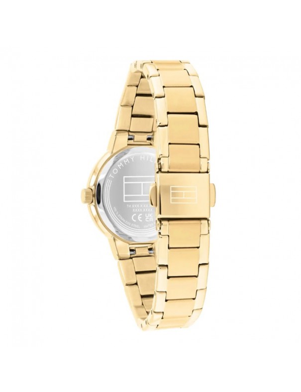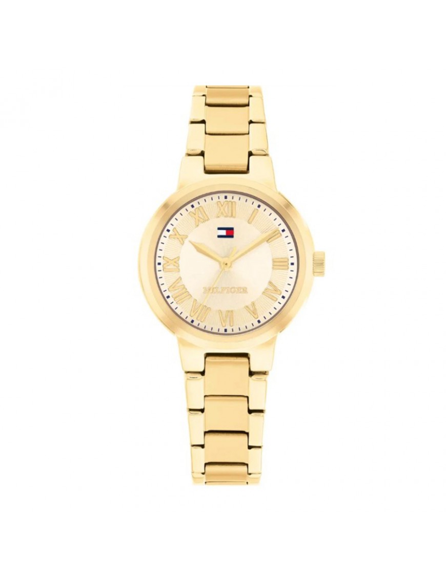 Reloj Tommy Hilfiger 1782905. Elegante reloj de dama de estilo clásico y contemporáneo con caja redonda de acero inoxidable chapado en tono dorado de 28 mm de diámetro que alberga un fiable movimiento de cuarzo Seiko, acompañado de una pulsera metálica a juego y protegido por cristal mineral resistente a arañazos; su esfera completamente dorada y manecillas a juego ofrecen una lectura clara y sofisticada del tiempo, mientras que su diseño ligero y de proporciones femeninas lo hace ideal tanto para el uso diario como para eventos formales, siendo resistente al agua hasta 3 ATM (salpicaduras).
