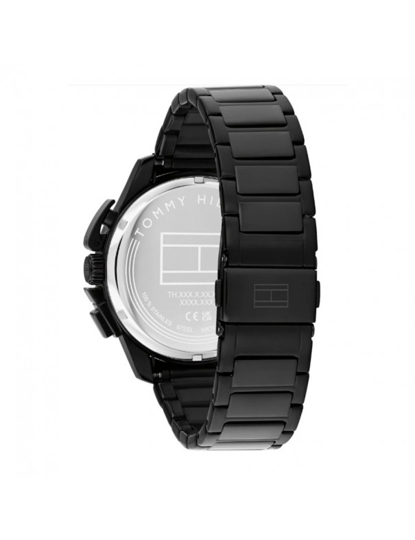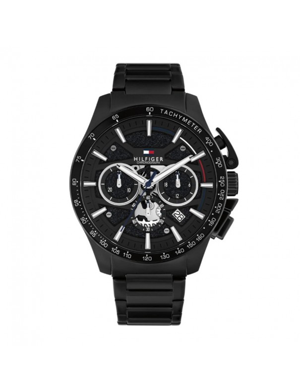 Reloj Tommy Hilfiger 1792262. Reloj cronógrafo masculino de diseño moderno y deportivo en acabado totalmente negro, con una caja robusta de acero inoxidable recubierta PVD de 44 mm que aporta presencia y durabilidad, junto con un bisel de aluminio negro y detalles protectores en los pulsadores que refuerzan su estética técnica y funcional; su esfera negra combina subesferas de cronógrafo y una ventana de fecha, ofreciendo versatilidad para el día a día o eventos casuales, mientras que la pulsera integrada en acero negro con recubrimiento PVD asegura comodidad y resistencia al desgaste para uso continuo, siendo además resistente al agua hasta 5 ATM (50 m) para soportar salpicaduras y breves inmersiones.