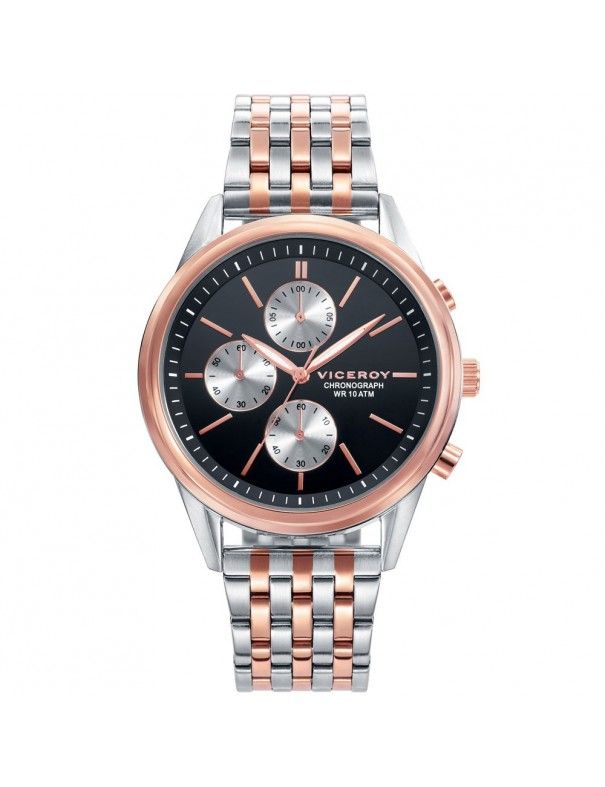 Reloj Viceroy Hombre Multifunción Magnum 401123-57. De la colección Magnum. Es un reloj diseñado por la marca Viceroy, para hombre. Es un modelo analógico con movimiento de cuarzo de tres agujas luminiscentes y con los indicadores horarios en forma de índice color oro rosa luminiscentes al igual que el bisel totalmente liso. La caja que contiene el mecanismo es de acero inoxidable de 41 milímetros de diámetro. La correa es de acero inoxidable bicolor: plateado y oro rosa con cierre de seguridad desplegable. Este elegante reloj tiene una esfera redonda de color negra que está protegida por un resistente cristal de zafiro con tres miniesferas en color blanco con coronógrafo. Este reloj es sumergible a 100 metros 10 ATM. Somos distribuidores oficiales de los Relojes Viceroy que ofrecen una garantía de 2 años contra cualquier defecto de fabricación. Todos nuestros pedidos se envían con envoltorio especial de regalo.