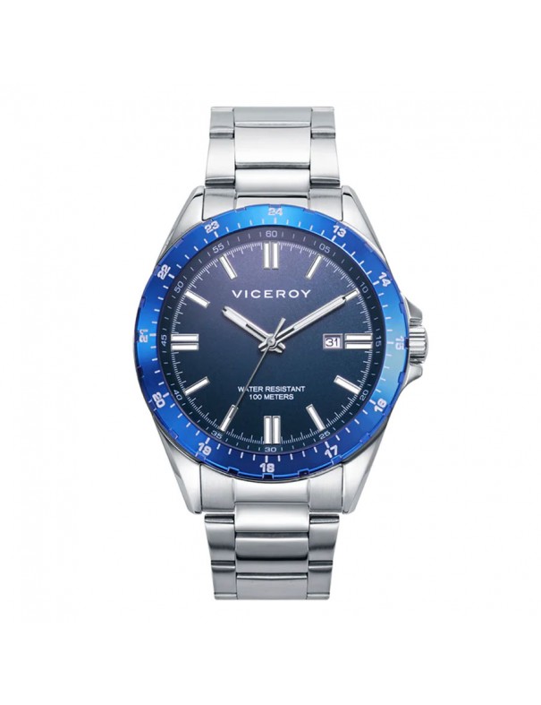 Reloj Viceroy para hombre 401295-33. La pulsera es de acero con cierre de doble pulsador. La esfera es de acero y mide 43 mm de diámetro. Incluye calendario. Es sumergible a 10 ATM y permite el buceo sin botella. Garantía de tres años.