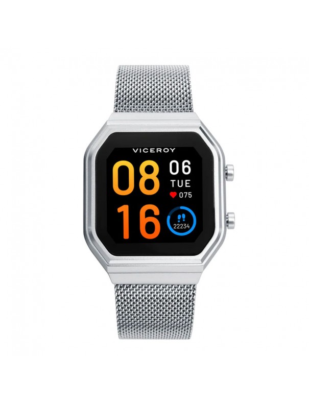 Reloj Viceroy Smart Unisex 41121-00. L esfera es de aluminio y mide 38 mm de ancho. La pulsera es de acero con cierre deslizante. Incluye funciones smart como responder llamadas, notificaciones de aplicaciones, podómetro, pulsómetro, medición de presión arterial y calorías, control del sueño y funciones deportivas entre otras. No es sumergible (IP67) y sólo permite la inmersión ocasional a 0,5 metros durante un máximo de 30 minutos. Garantía de tres años.