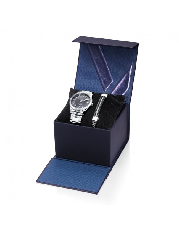 Pack Reloj Viceroy Magnum para hombre 401331-55. La esfera es de acero y mide 42 mm de diámetro. la pulsera es de acero y lleva cierre de doble pulsador. Incluye calendario y una pulsera de acero y piel de regalo. Es sumergible a 10 ATM y tiene tres años de garantía.