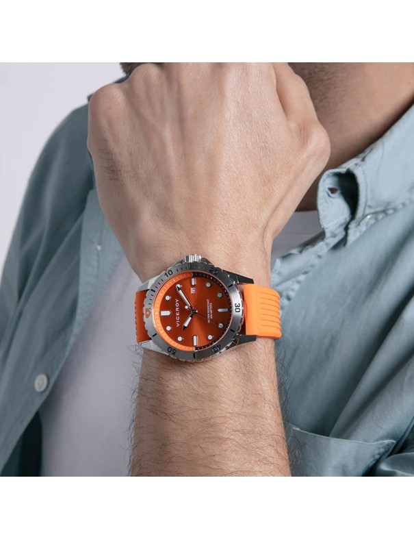 Reloj Viceroy para hombre 20ATM 401367-97. La caja es de acero y mide 43 mm de diámetro. La pulsera es de silicona con hebilla de acero. Incluye bisel giratorio unidireccional, corona roscada y calendario. Es sumergible a 20 ATM (buceo con botella) y tiene tres años de garantía.