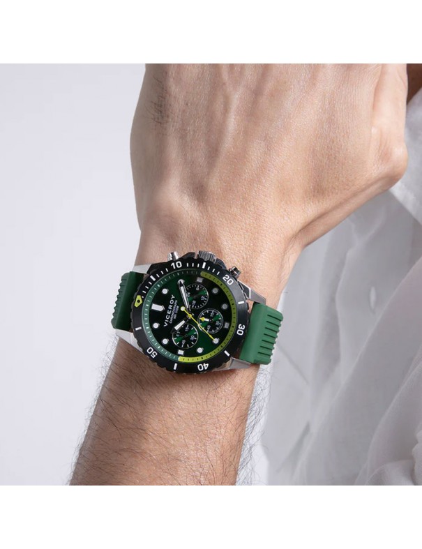 Reloj Viceroy para hombre 20ATM 401369-67. La caja es de acero y mide 43 mm de diámetro. La pulsera es de silicona con hebilla de acero. Incluye bisel giratorio unidireccional, corona roscada y cronógrafo. Es sumergible a 20ATM (buceo con botella) y cuenta con tres años de garantía.