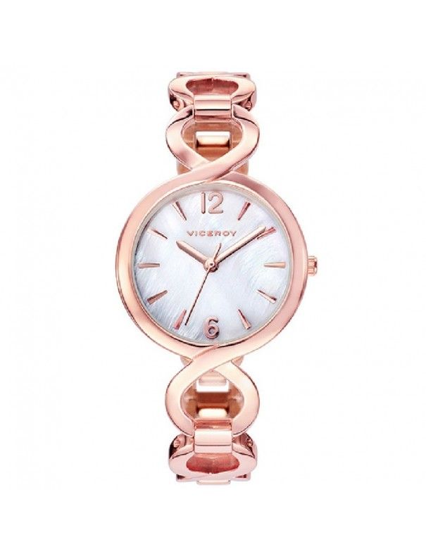 Este reloj Viceroy es de acero antialérgico e inoxidable, terminado en color oro rosa. La caja que encierra al mecanismo mide 28.00mm y es sumergible a 30 metros. Un cristal mineral cubre a la esfera, la cual es de color irisada. Los indicadores de la hora son índices y números arábigos de color oro rosa.