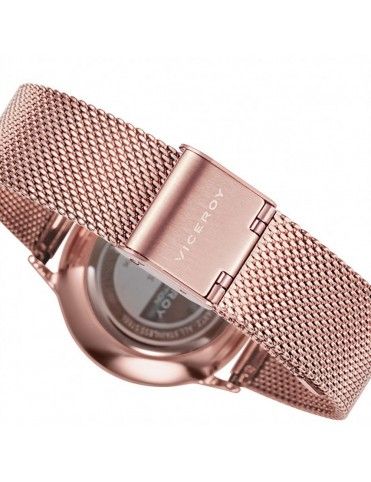 Reloj Viceroy Mujer Kiss 461096-97. Es un modelo analógico de tres agujas. La caja, en acero inoxidable antialégico oro rosa contiene el mecanismo que mide 33 milímetros de diámetro. La correa es tipo malla milanesa en color oro rosa. Este elegante reloj tiene una esfera redonda adornada con flores multicolor