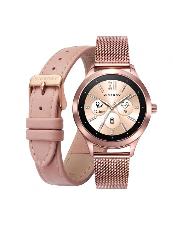 Pack SmartPro Viceroy Mujer 401142-70, smartwatch con pantalla de 1,10 pulgadas, resolución de 240X240p. Caja de 40mm de diámetro. Pulsera milanesa de acero en color cobrizo y una segunda pulsera de piel rosa. Entre sus funciones encontramos: notificación de llamadas y mensajes, alarma, cronómetro, gestión del sueño, medición de pulsaciones, calorías consumidas, distancia recorrida, oxígeno en sangre, presión arterial, ciclo menstrual, aviso de sedentarismo e hidratación, podómetro, control de música, activación mediante giro de muñeca, personalización de esfera... Se conecta al smarphone vía Bluetooth. Tiempo de carga de 4 horas. Duración de 7 días con uso normal, 15 días en modo stand-by aproximadamente. Impermeabilidad IP68. Compatible con versión Android 5 o superior e IOS 10 o superior.