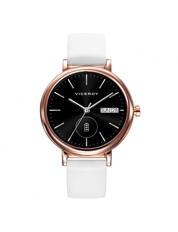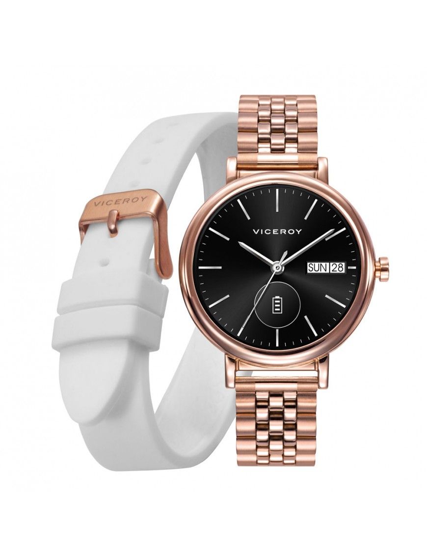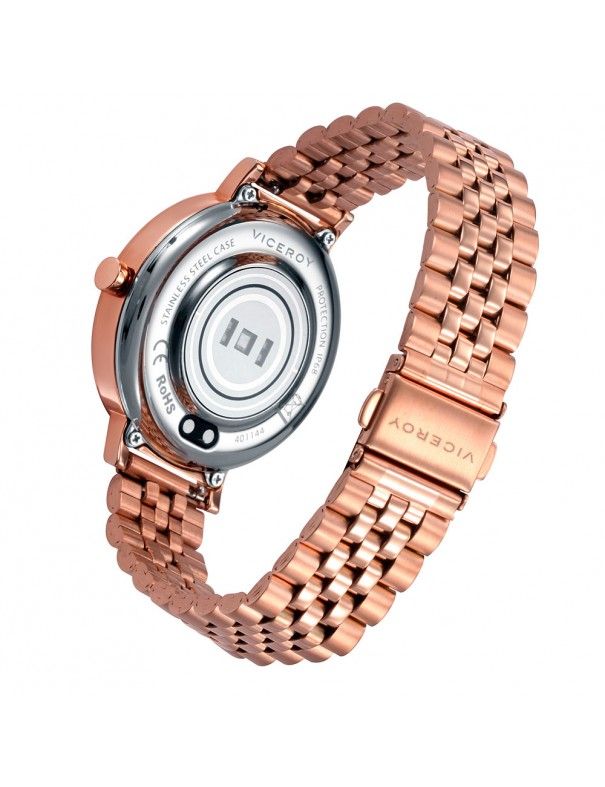 Pack SmartPro Viceroy Mujer 401144-70, smartwatch con pantalla de 1,10 pulgadas, resolución de 240X240p. Caja de 40mm de diámetro. Pulsera milanesa de acero en color cobrizo y una segunda pulsera de caucho blanco. Entre sus funciones encontramos: notificación de llamadas y mensajes, alarma, cronómetro, gestión del sueño, medición de pulsaciones, calorías consumidas, distancia recorrida, oxígeno en sangre, presión arterial, ciclo menstrual, aviso de sedentarismo e hidratación, podómetro, control de música, activación mediante giro de muñeca, personalización de esfera... Se conecta al smarphone vía Bluetooth. Tiempo de carga de 4 horas. Duración de 7 días con uso normal, 15 días en modo stand-by aproximadamente. Impermeabilidad IP68. Compatible con versión Android 5 o superior e IOS 10 o superior.