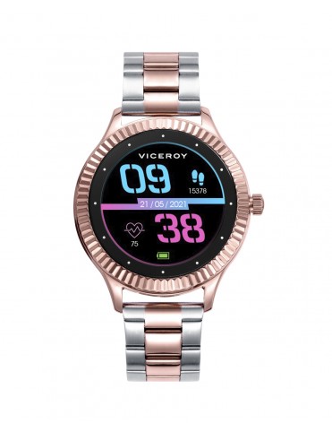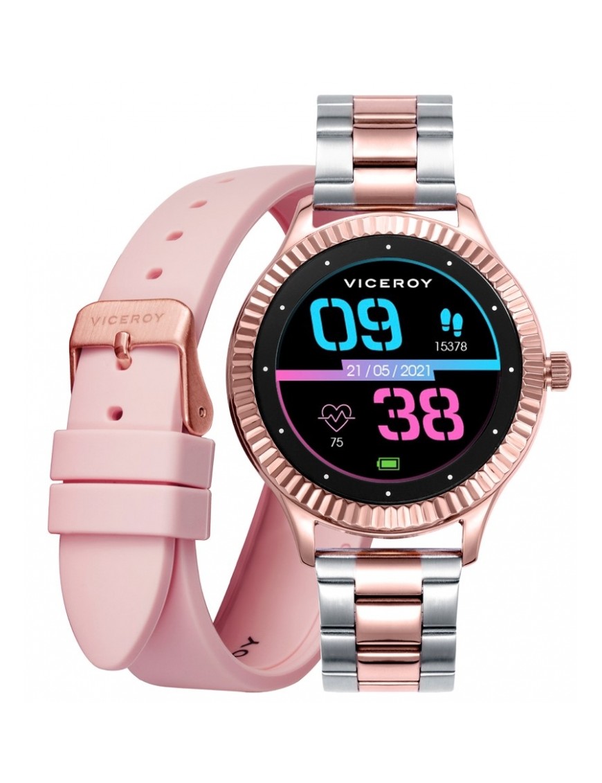 Pack SmartPro Viceroy Mujer 401152-40, smarwatch. Caja de acero de 40mm de diámetro. Pantalla Full Round Display de 1.10 pulgadas, resolución 240X240 pixeles. Función de podómetro, pulsaciones, cronómetro, gestión de deportes, gestión del sueño, ciclo menstrual, presión arterial, oxígeno en sangre, notificación de llamadas y mensajes, personalización de pantalla, cámara remota, clima, control de música...