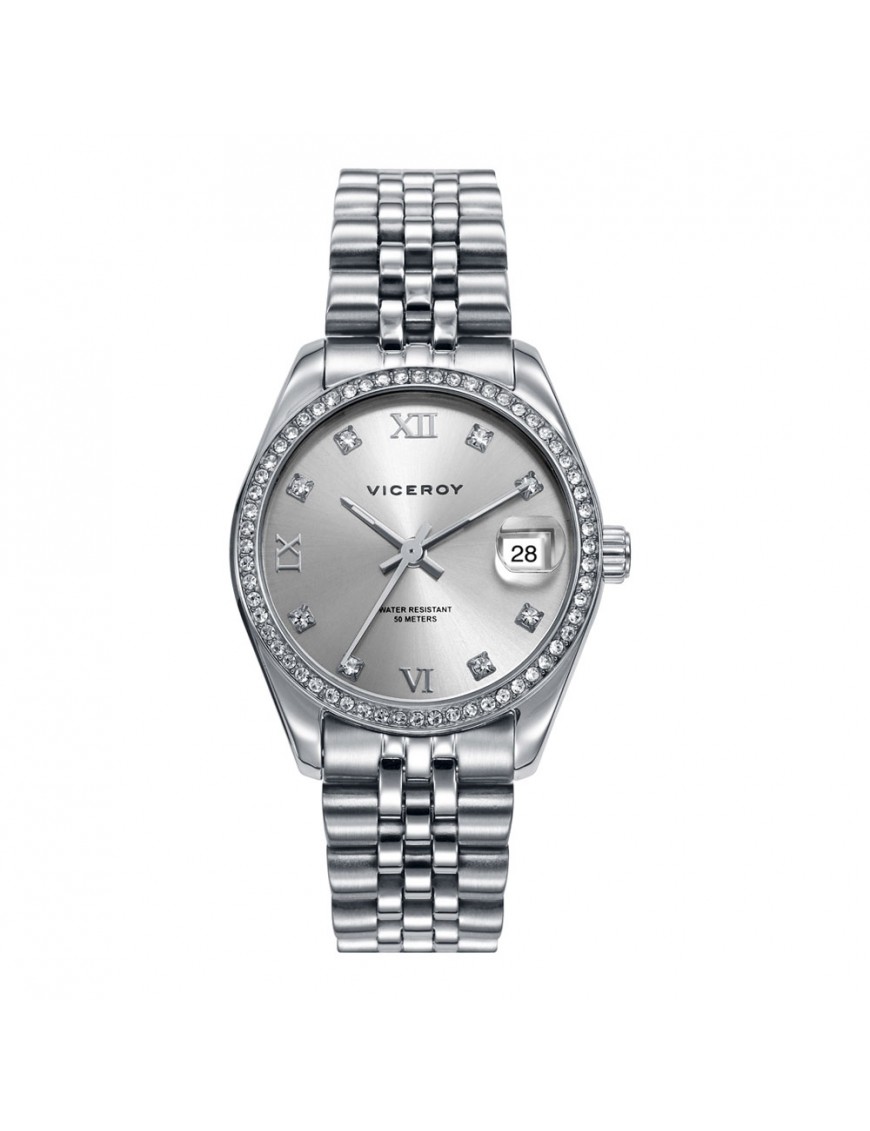 Reloj Viceroy Chic Mujer 42416-83, analógico de tres agujas y ventana de calendario. Bisel y esfera decorados con circonitas blancas. Caja de acero de 32mm de diámetro. Pulsera de acero. Sumergible a 5ATM, por lo que es apto para ducha y baño sin inmersión.