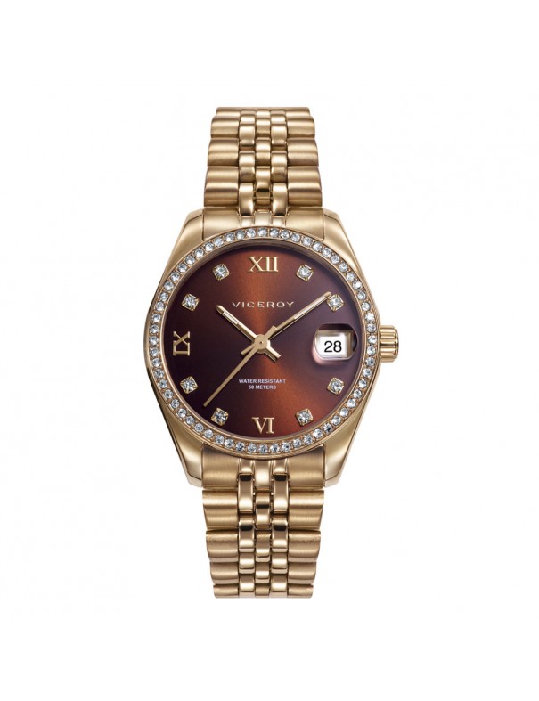 Reloj Viceroy Chic Mujer 42416-43, analógico de tres agujas y ventana de calendario. Bisel y esfera decorados con circonitas blancas. Caja de acero de 32mm de diámetro. Pulsera de acero bañado en color dorado. Sumergible a 5ATM, por lo que es apto para ducha y baño sin inmersión.
