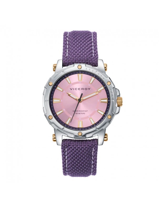 Reloj Viceroy para mujer 401178-77. La esfera es de acero y mide 38 mm de diámetro. La pulsera es de nylon con hebilla. Es sumergible a 10 ATM y permite el buceo sin botella. Garantía de tres años.