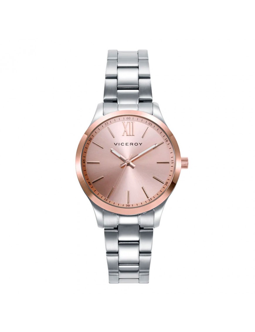 Reloj Viceroy para mujer 401180-73. La esfera es de acero y mide 34 mm de diámetro. La pulsera es del mismo material y lleva cierre con doble pulsador. Es sumergible a 5 ATM por lo que permite el nado en superficie sin inmersión. Garantía de tres años.