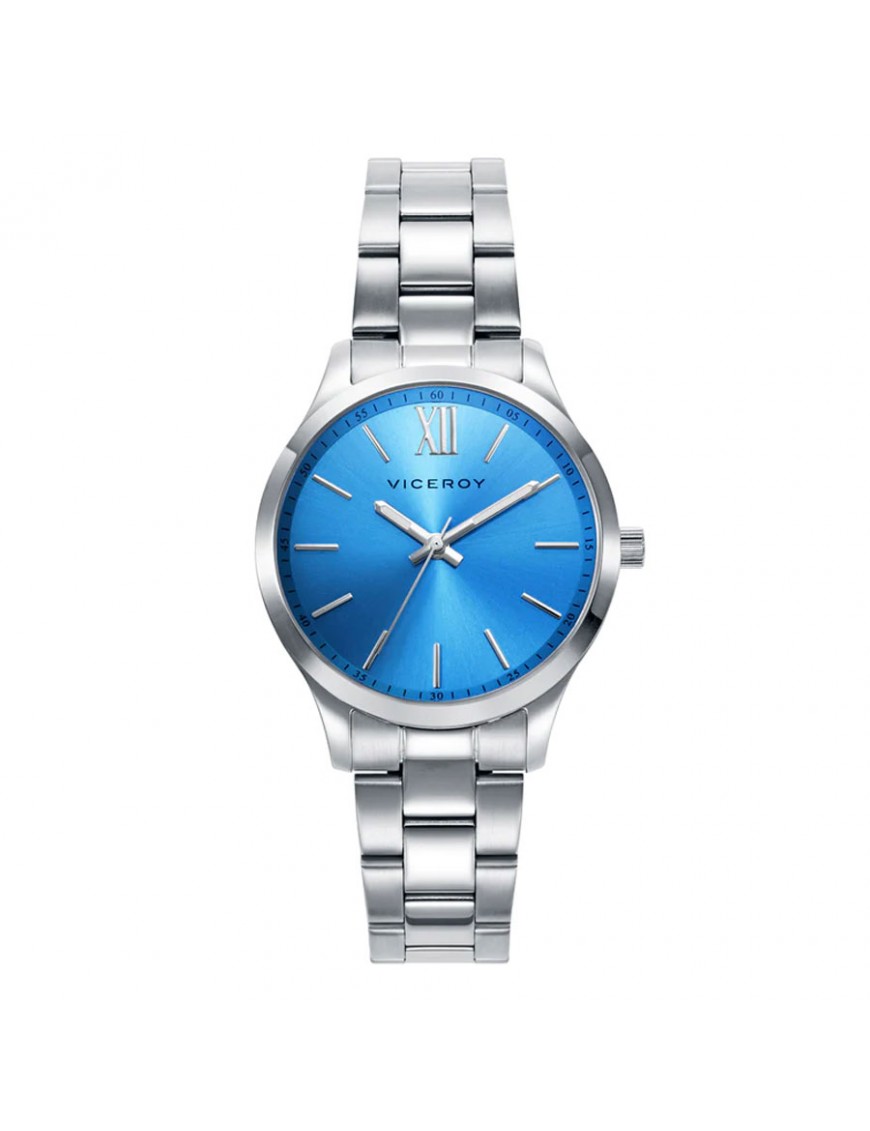 Reloj Viceroy para mujer 401180-93. La esfera es de acero y mide 34 mm de diámetro. La pulsera es del mismo material y lleva cierre de doble pulsador. Es sumergible a 5ATM y permite el nado en superficie sin inmersión. Garantía de tres años.