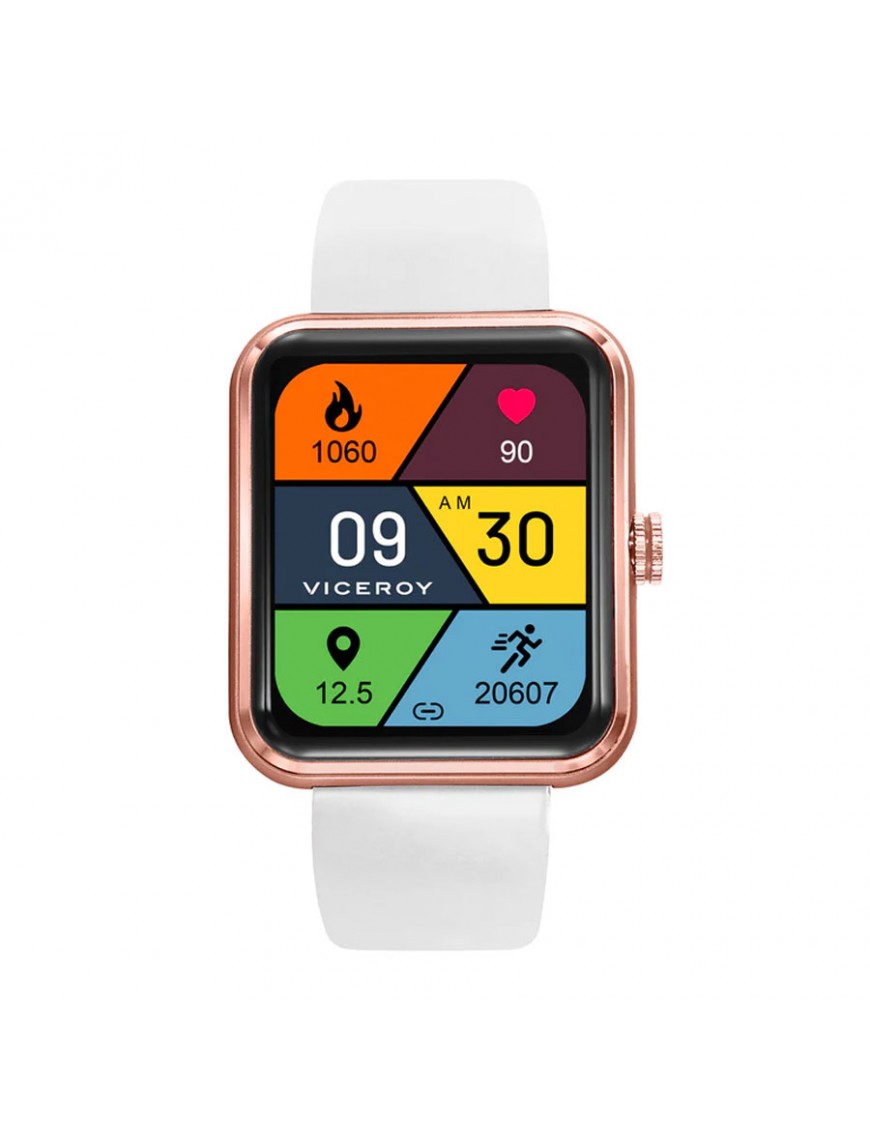 Reloj Viceroy Smart Unisex 41117-70. La pulsera es de silicona con hebilla. La esfera es de aluminio y mide 38 mm de ancho. Incluye funciones smart como podómetro, cuanta calorías, medición de presión arterial y pulsaciones, modo deporte, notificaciones de llamadas y aplicaciones, entre otros.