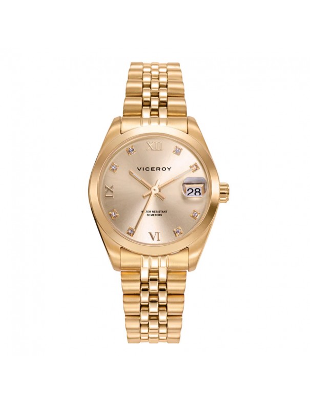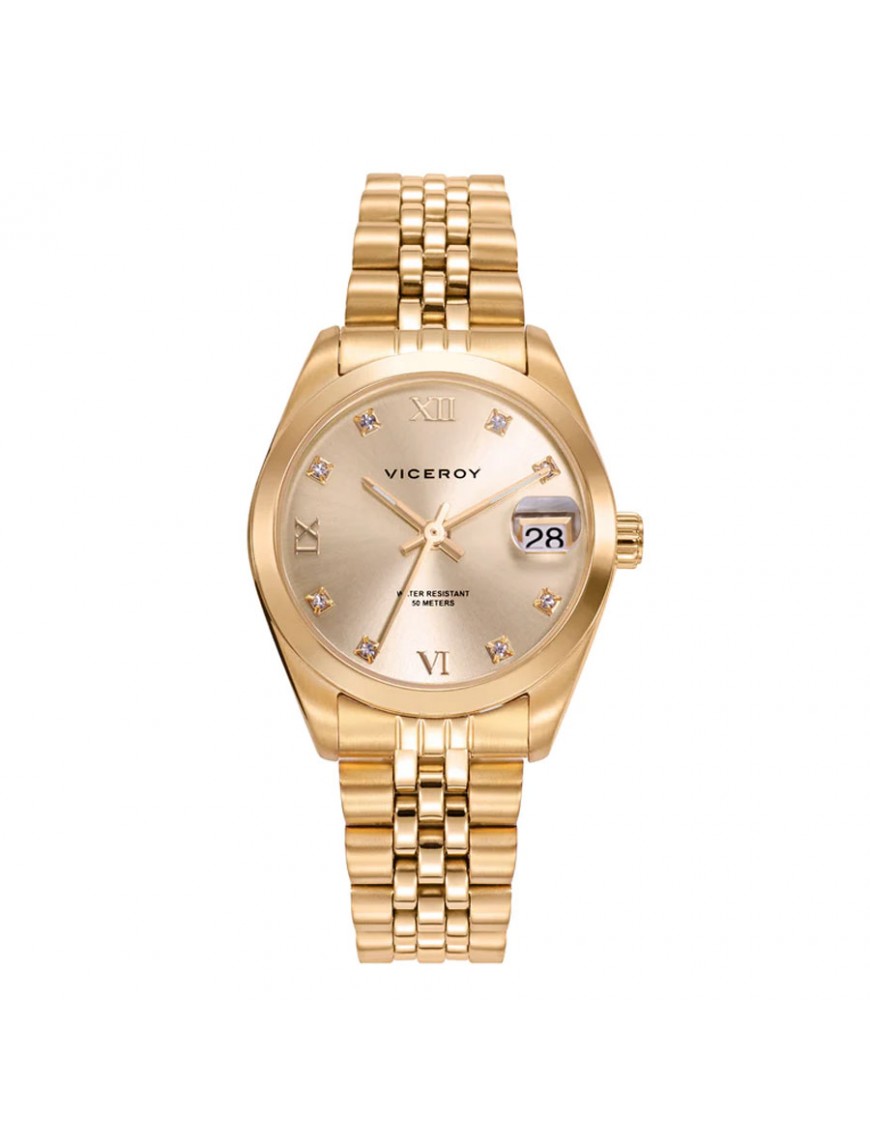 Reloj Viceroy para mujer 42414-23. La esfera es de acero y mide 32 mm de diámetro. La pulsera es del mismo material con cierre de doble pulsador. Incluye calendario. Es sumergible a 5 ATM por lo que permite el nado en superficie sin inmersión. Garantía de tres años.