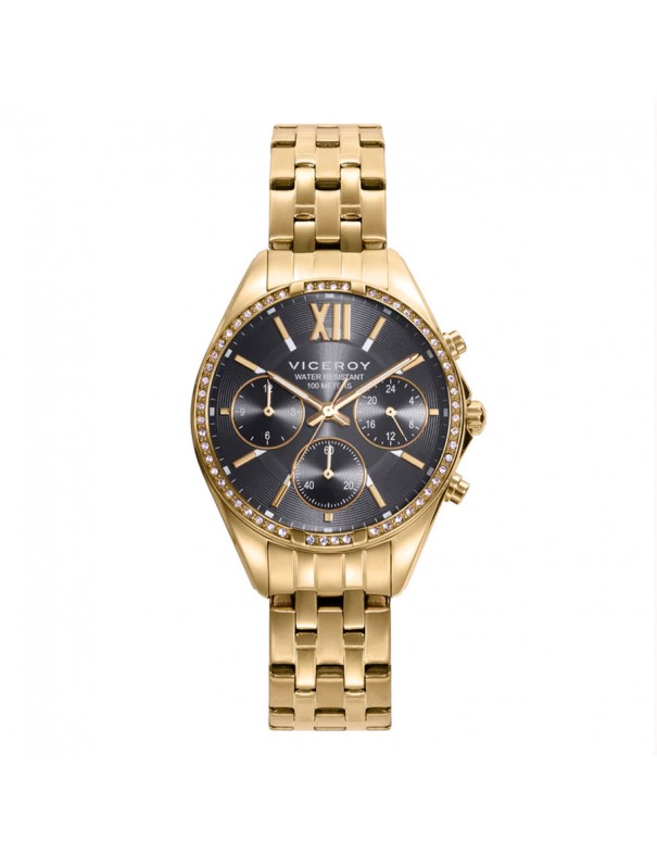 Reloj Viceroy Chic para mujer 401186-13. La esfera es de acero dorado con piedritas y mide 37 mm de diámetro. La pulsera es de acero dorado con cierre de doble pulsador. Es sumergible a 10 ATM y tiene tres años de garantía.