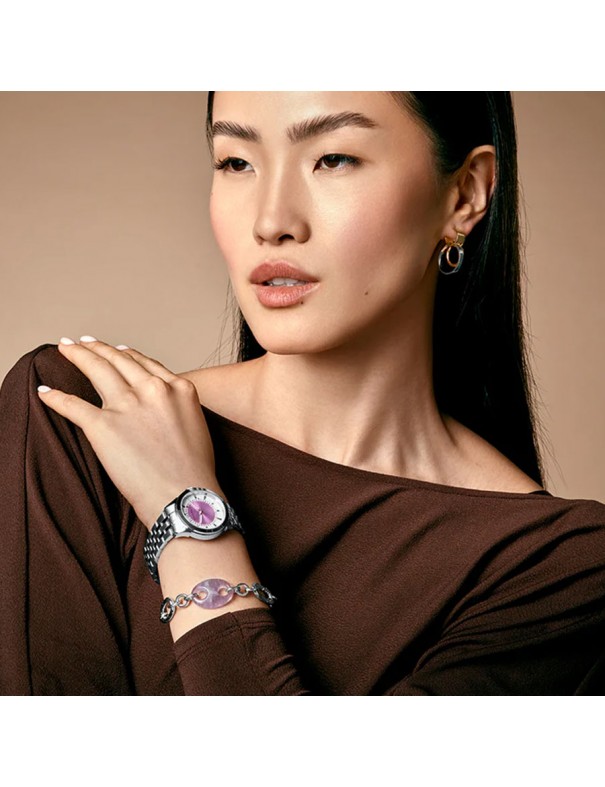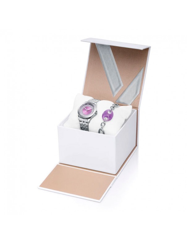 Pack Reloj Viceroy Chic para mujer 401194-77. La esfera es de acero de 33 mm de diámetro. La pulsera es de acero con cierre de doble pulsador. Incluye una pulsera a juego con amatista natural. No es sumergible (3AT) y tiene tres años de garantía.