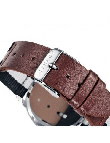 Reloj Viceroy Niño Multifunción 401095-05. Es un reloj diseñado por la marca Viceroy para niño de la Colección Comunión. Es un modelo analógico multifunción, con movimiento de cuarzo alimentado con pila. La caja que contiene el mecanismo mide de diámetro 35 milímetros, es sumergible a 50 metros y está hecha en acero antialérgico e inoxidable. Un cristal mineral cuida a la esfera, la cual es de color blanca y negra. Los indicadores de la hora son índices menos el 12 en número arábigo luminiscentes. Por otro lado, La correa es de nylon-piel en rayas negras y blancas con cierre en hebilla. Somos distribuidores oficiales de los relojes Viceroy que cuentan con una garantía de 2 años contra defectos de fabricación.